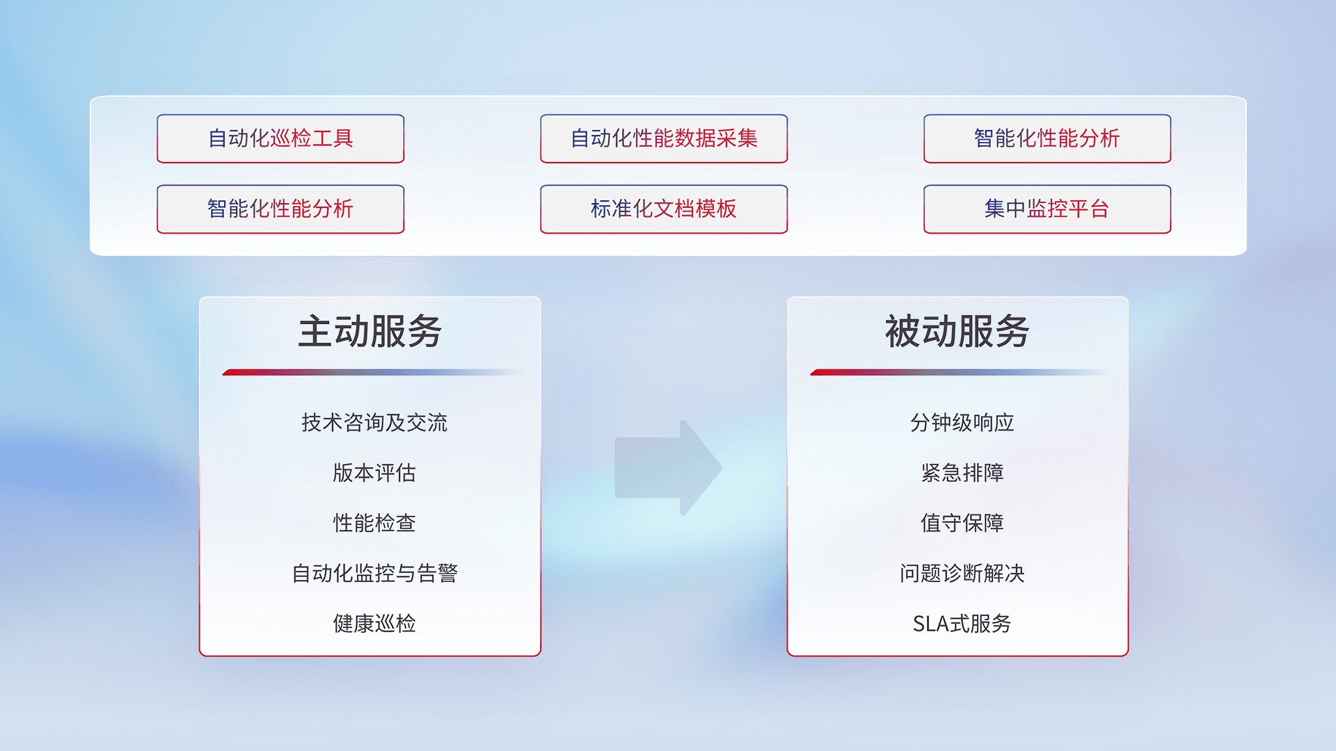智能化工具和标准化文档,,,保障服务质量,,,,提供主动服务(包含技术咨询、、、版本评估、、、性能检查、、、、自动化监控与告警、、、、健康巡检)和被动服务包含(分钟级响应、、、、紧急排障、、、值守保障、、、、问题诊断解决、、、SLA服务)。。。。